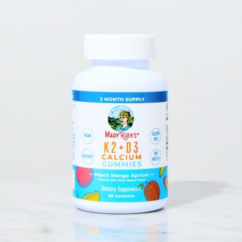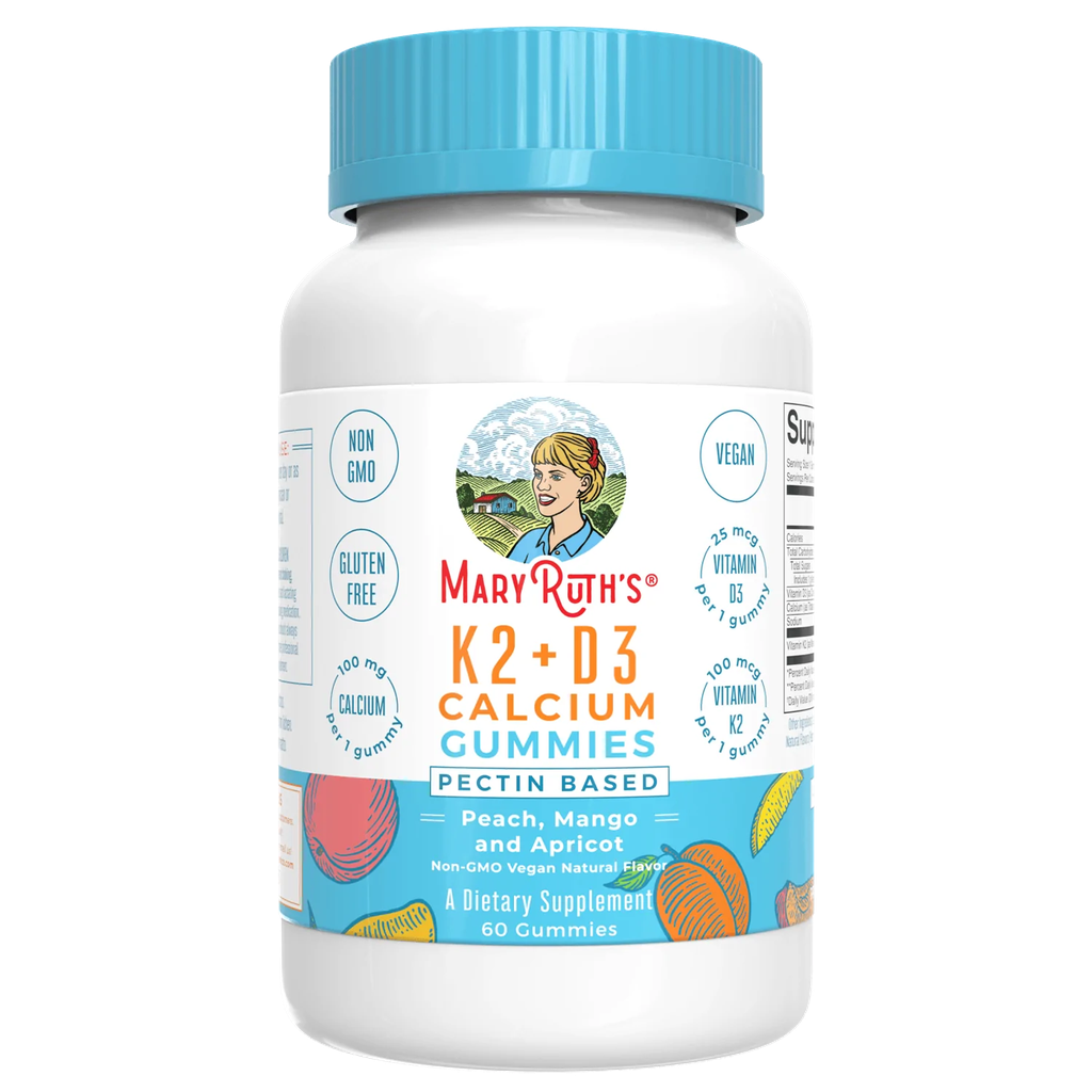 MaryRuths K2 + D3 Calcium Gummies bổ sung đồng thời Vitamin K2+D3 và Canxi với hương vị thơm ngon của ba loại trái cây: Đào, Xoài & Mơ. Trong đó, Vitamin D3 trong kẹo có nguồn gốc từ Địa y thuần chay, không biến đổi gen, được làm thủ công. Còn K2 có nguồn gốc từ Natto, một sản phẩm đậu nành lên men truyền thống của Nhật Bản, đây là nguồn thực phẩm chứa K2 tự nhiên cao nhất.
