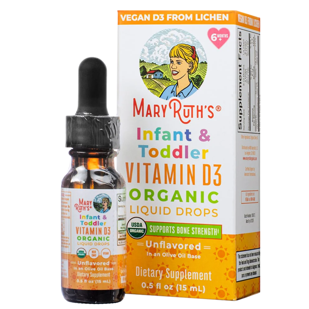 Vitamin D3 dạng giọt hữu cơ MaryRuth’s có nguồn gôc từ địa y, được bào chế phù hợp với trẻ 6 tháng – 3 tuổi. Sản phẩm không mùi, dễ uống, có thể thêm vào sữa hay đồ uống của trẻ.